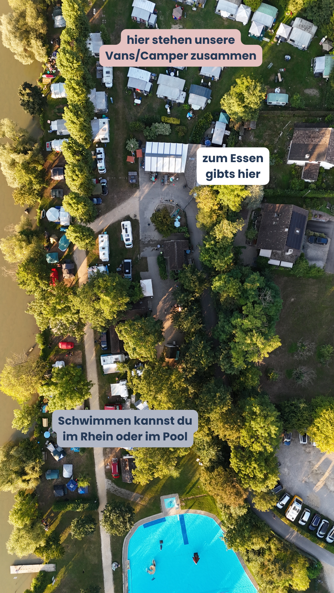 Nach deiner verbindlichen Anmeldung und Zahlung erhältst du eine Bestätigung per E-Mail. Danach schreibe bitte dem Campingplatz (camping-kaiseraugst@bluewin.ch) eine Email, um dir einen Stellplatz für dein Fahrzeug oder Zelt zu sichern. (Die Betreiberinnen sind Freundinnen von mir, daher erwähne bitte, dass du zu dem Event kommst. Dann haben wir alle einen Stellplatz nebeneinander.)
