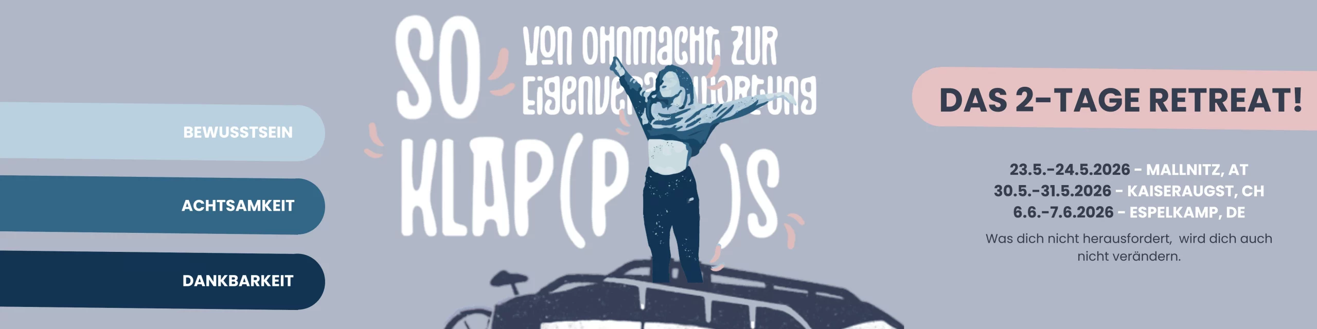 Sei dabei, wenn du nach dem Klaps auf den Po nun auch wissen möchtest wie es klappt und sei Teil unseres zauberhaften Retreats „SO KLAP(pt)S – von Ohnmacht zu Eigenverantwortung“.